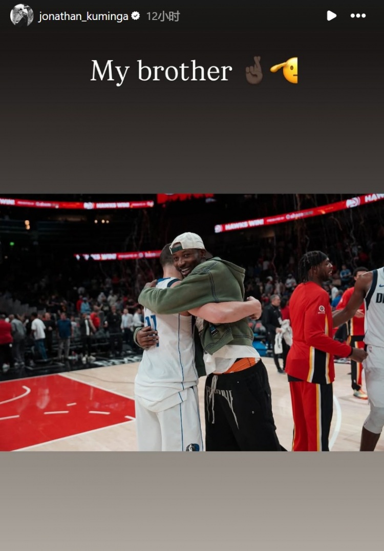赛后,库明加晒出了与克莱拥抱的照片,并写道:“我的兄弟。”